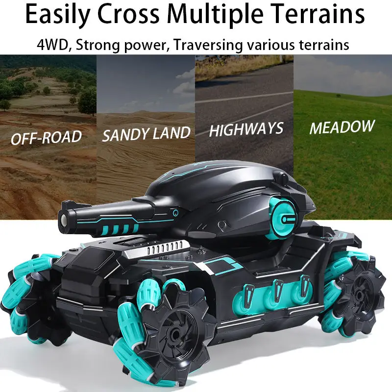 Радіокерований іграшковий автомобіль танк 2,4Ghz, зі звуковими ефектами та підсвіткою. Стріляє водними кулями орбіз. 4WD підвищеної прохідності повний привод. Спеціальна конструкція коліс для екстремальної маневреності. Подвійне керування — пульт і браслет