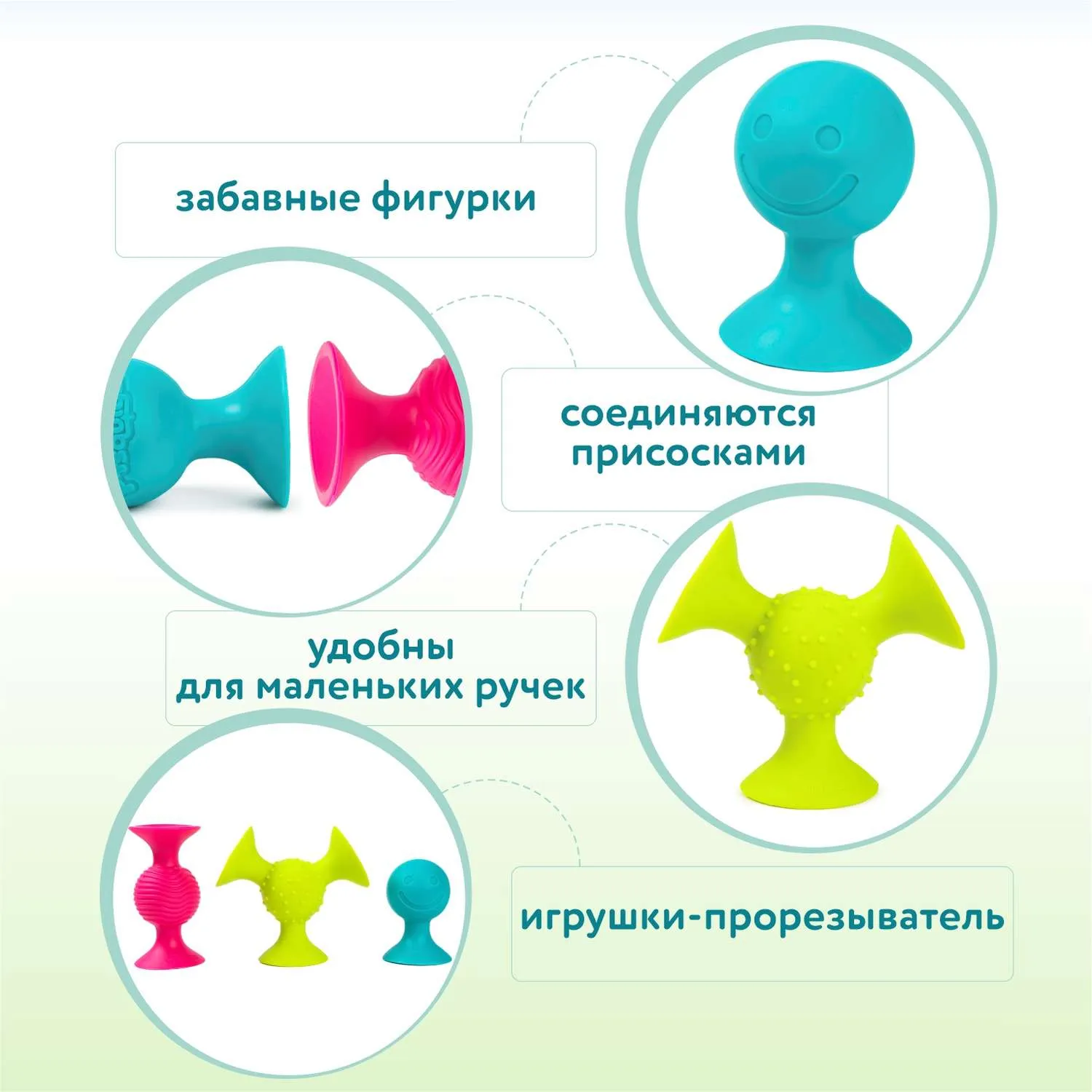 PipSquigz — унікальна розвивальна іграшка 3 в 1 для малюків від 6 місяців. Мама може відпочити, адже малюк зайнятий надовго. У наборі 3 різнобарвні сенсорні брязкальця-приліпали з 1-го, 2, 3 присосками.